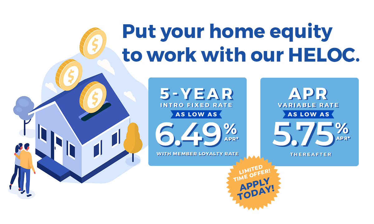 Don't miss out on the opportunity to get more out of your home! Our flexible Home Equity Line of Credit (HELOC) offers an introductory fixed Annual Percentage Rate as low as 6.49% when you take advantage of our Member Loyalty Discount opportunity.