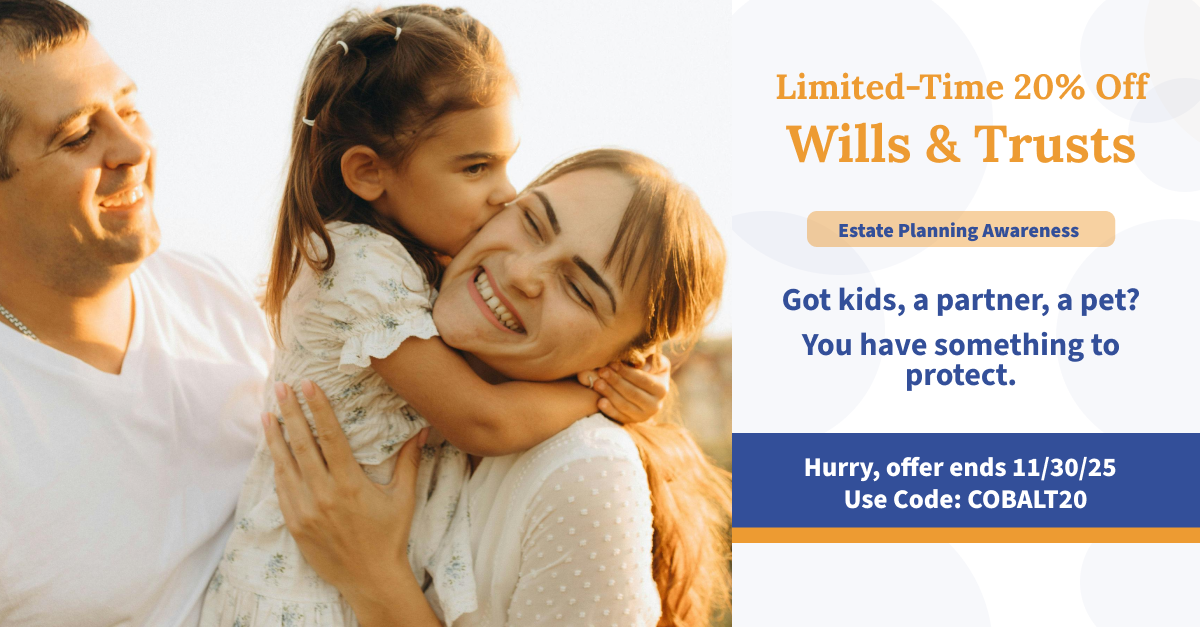 National Estate Planning Awareness Week is October 20th - 26th. To celebrate, Cobalt is offering you an exclusive 20% savings on Wills and Trusts now through 11/30/2025*. Whether growing your family, preparing for retirement, or safeguarding your wishes, we make it simple and affordable.